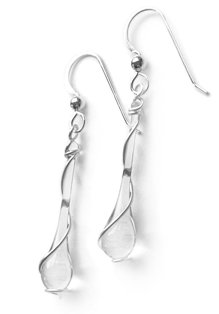 These delicate, perfectly clear glass earrings with a silver spiral will quickly become your new favorites! A graceful spiral of silver twines around each drop of sun-melted glass. These earrings are designed to make you feel elegant in every situation, from weekend casual to a night on the town.