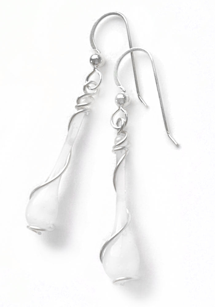 These delicate opalescent white glass earrings with a silver spiral will quickly become your new favorites! A graceful spiral of silver twines around each drop of sun-melted glass. These earrings are designed to make you feel elegant in every situation, from weekend casual to a night on the town.