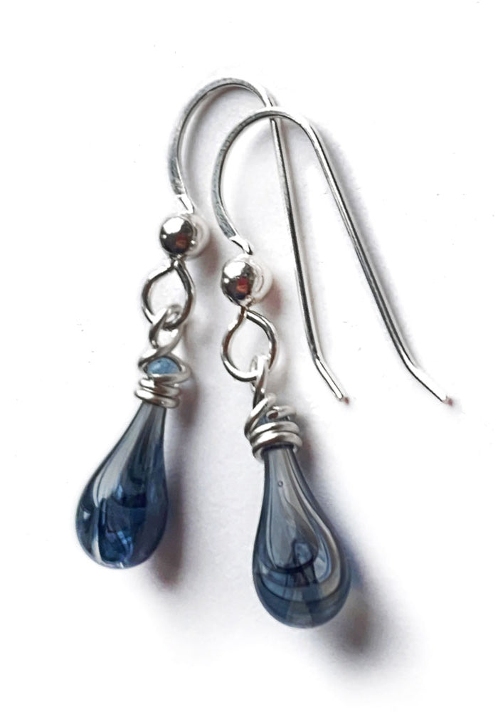 A hazy blue-black swirls within these dainty glass earrings, like smoke from a fall campfire, frozen forever in an elegant drop of glass.