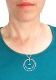 This necklace of glittering circles and a single drop of sun-melted glass is just the thing to celebrate the changing of the celestial seasons. Dangling from a recycled sterling silver chain, a dainty drop of color is framed in circles of sparkling silver, with each element swinging freely. Whether you like to match or contrast with your favorite outfit, one of these shining colors will be just your cup of tea!- Pendant length: 1 1/4" (3.5 cm), hanging from an 18" sterling silver chain